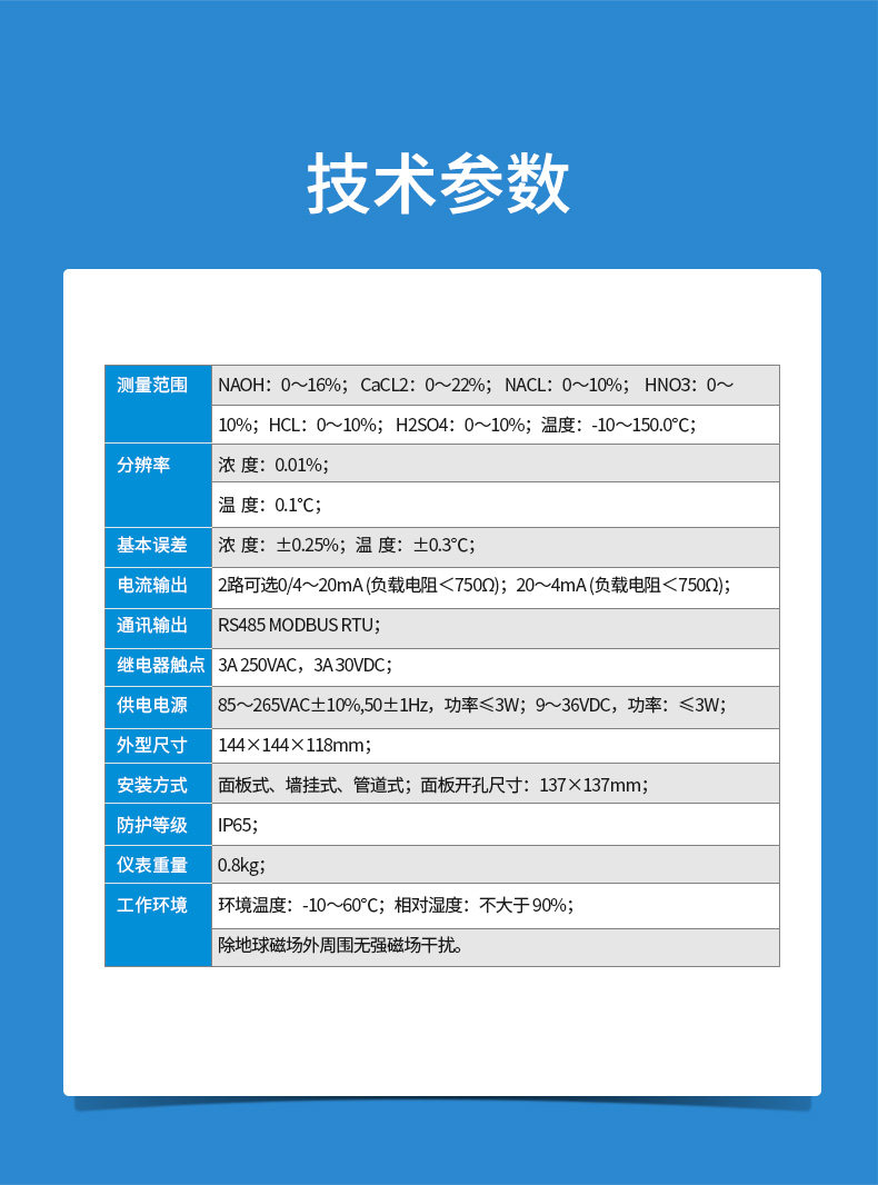 工業(yè)在線酸/堿/鹽濃度在線監(jiān)測控制儀是帶微處理器的水質(zhì)在線監(jiān)測控制儀。該儀表廣泛用于火電、化工、鋼鐵酸洗等行業(yè),如電廠對離子交換樹脂的再生,化工化學(xué)工業(yè)過程等,對水溶液中的化學(xué)酸或堿濃度進行連續(xù)檢測和控制。