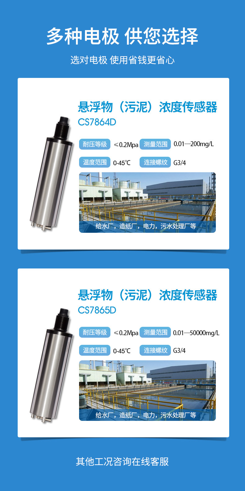 給水廠(沉淀池)、造紙廠(紙漿濃度)、洗煤廠(沉淀池)、電力(灰漿沉淀池)、污水處理廠(進出水口、曝氣池、回流污泥、初沉池、二沉池、濃縮池、污泥脫水)